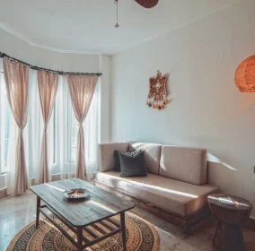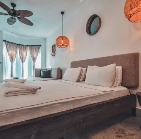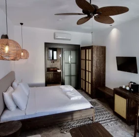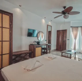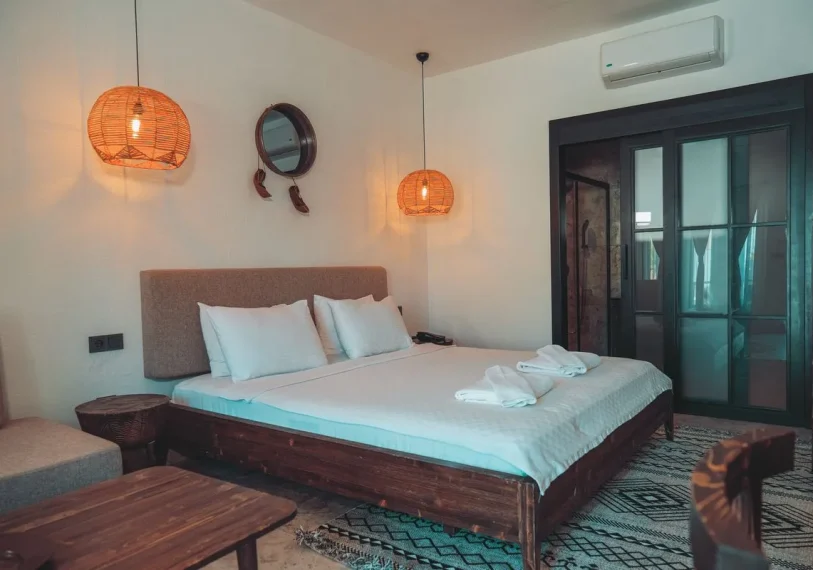 Our facility consists of 8 bungalows, each measuring 22 square meters. Each bungalow features a comfortable double bed and a 170 cm long sofa that can also be used as a bed for children up to 12 years old. The bungalows are equipped with a wardrobe, dressing table, bedside table, air conditioning, minibar, ceiling fan, TV, coffee machine, hair dryer, and a private terrace furnished with a table and chairs for your comfort.